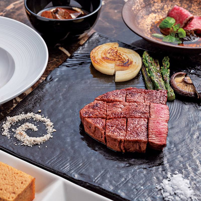 目の前で焼き上げてくれる近江牛ステーキコースは要予約。写真はヒレ150g16500円。取材日のコースにはマルシンのたたき、タンシチュー、外モモの生ハムサラダなどが登場。