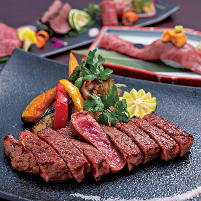 牛馬商としての創業は江戸年間。現在は「岡喜(おかき)グループ」として竜王町や八幡に牧場をもち、繁殖から肥育、加工、販売、輸出までを手掛ける。レストランは県内に6店舗。守山店は和食料理人の手になる料理が人気のカジュアル店舗で、丼やカレーもあるがぜひコースを。ハツのタタキや三角バラのトロ刺しなどの前菜やステーキで堪能したい。