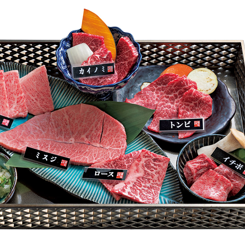 近江牛の希少部位も常時揃い、メニューは豊富。「本日のおまかせ3種盛り」300g4983円〜(写真は6種盛り)。